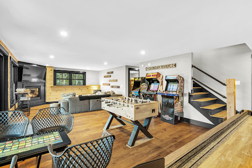 Downstairs gather around the 65" TV and fireplace where everyone can watch your favorite sports team or movie while others play video games, foosball, shuffleboard, or classic board games with a new twist on the Infinity Table.